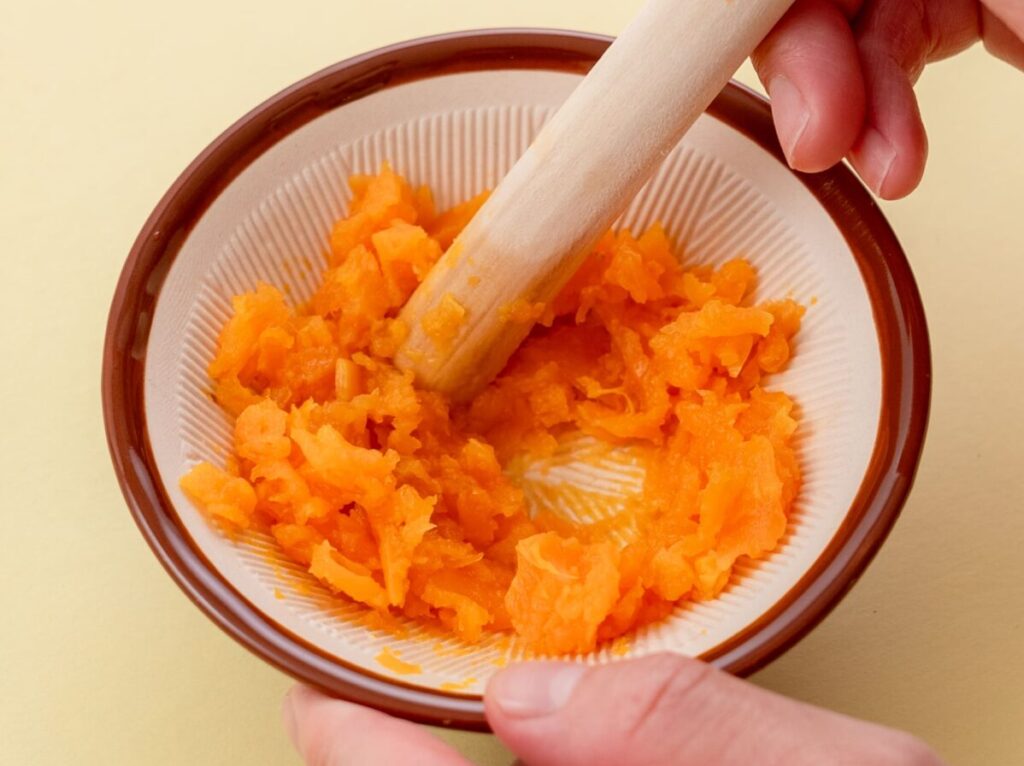 すり鉢などににんじんを入れてすりつぶし(ハンドブレンダーなどを使用してもOK)、ゆで汁を加えてなめらかになるまでのばす。