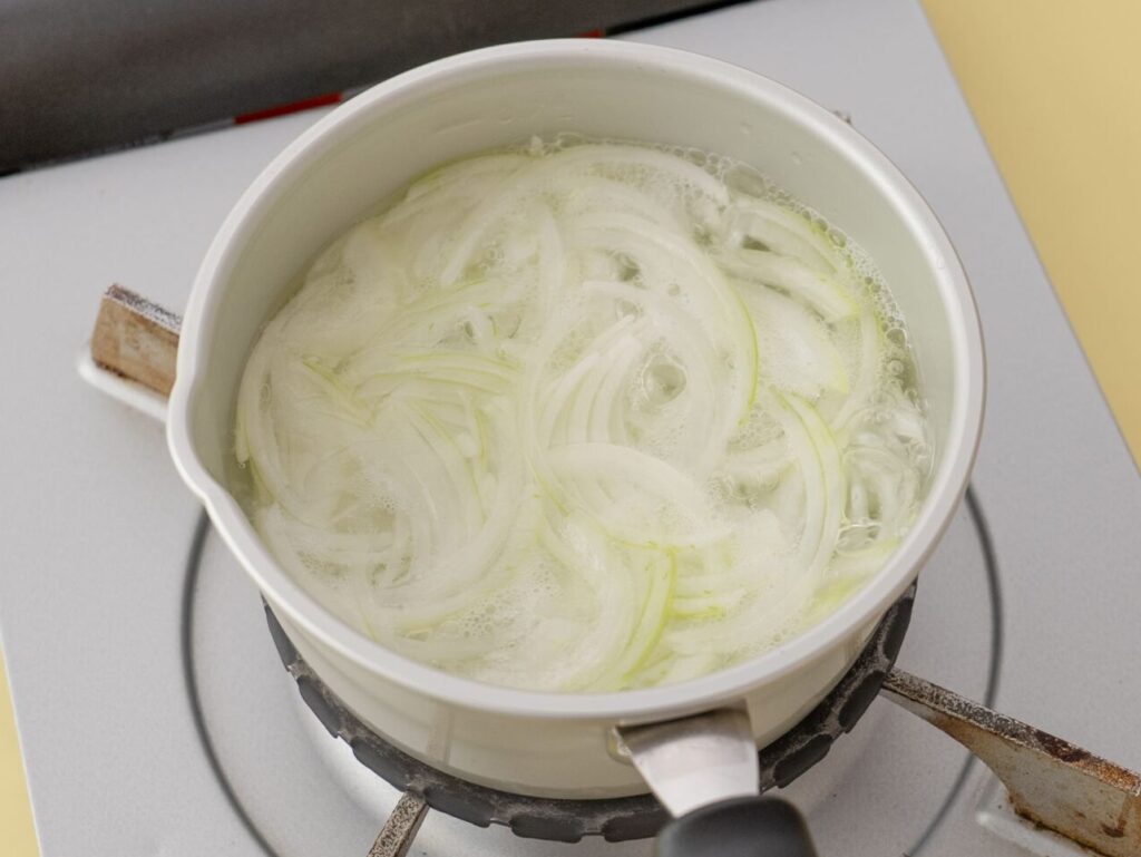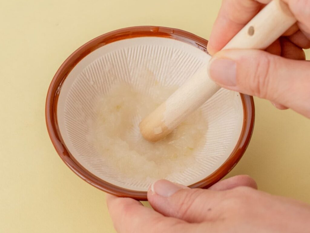 くたくたにやわらかくなったら、玉ねぎを取り出し、すり鉢などですりつぶし(ハンドブレンダーなどを使用してもOK)、必要であればゆで汁を加えてなめらかにすりつぶす。