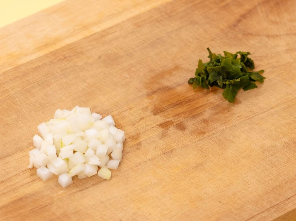 玉ねぎは5mmサイズ、わかめは7mmサイズに切る。
