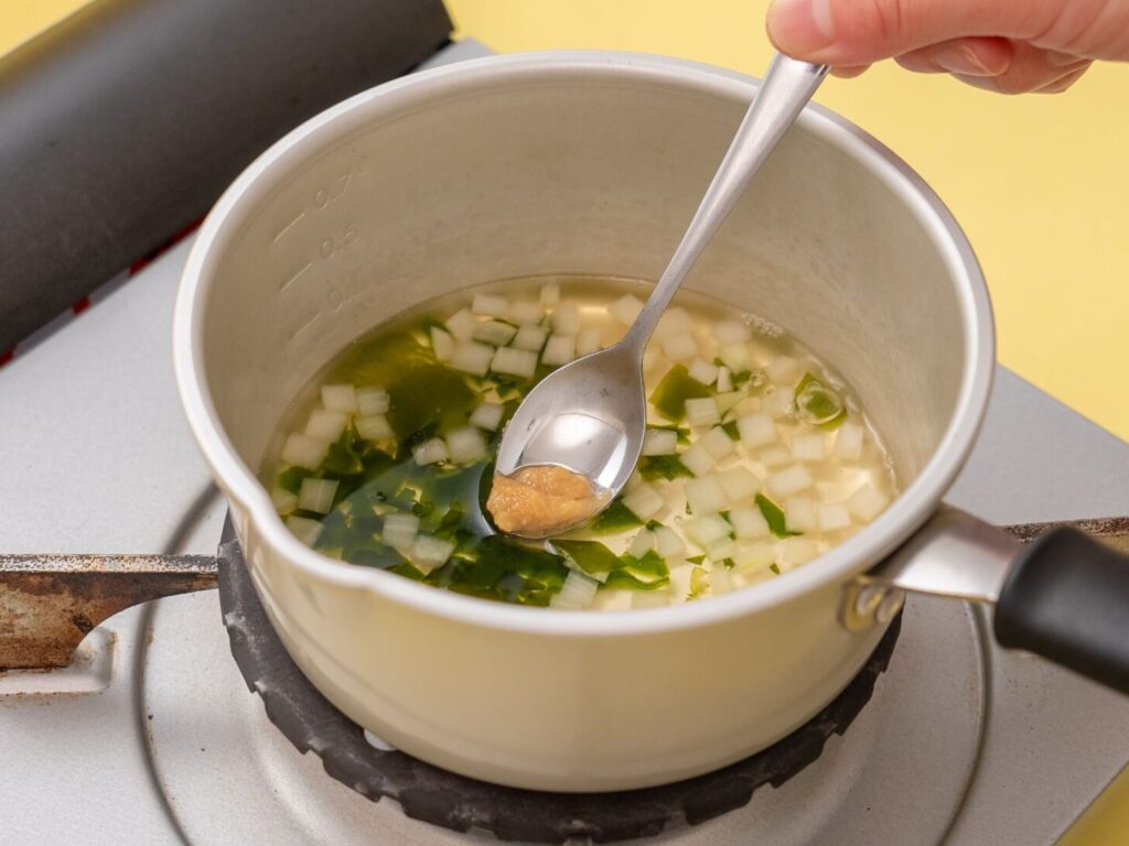 小鍋にだし汁、①の玉ねぎを入れて少し煮て、①のわかめを加える。やわらかくなるまで煮たら火を止め、みそを加える。