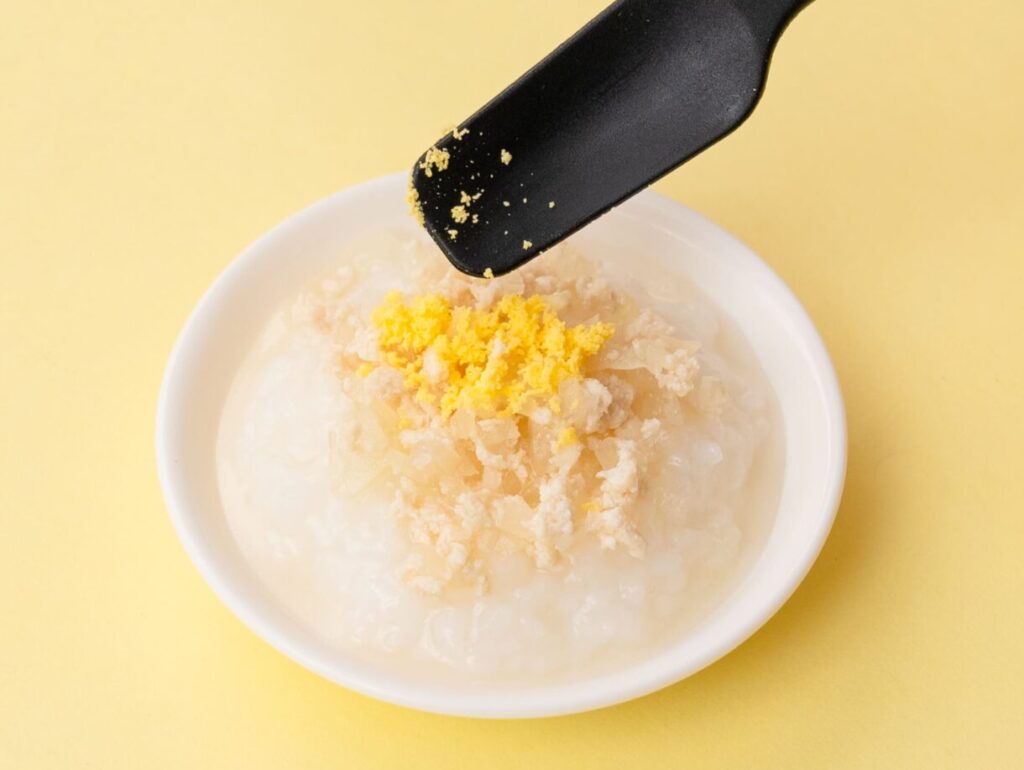 器に7倍がゆ を盛り、②をのせ、卵黄をのせる。