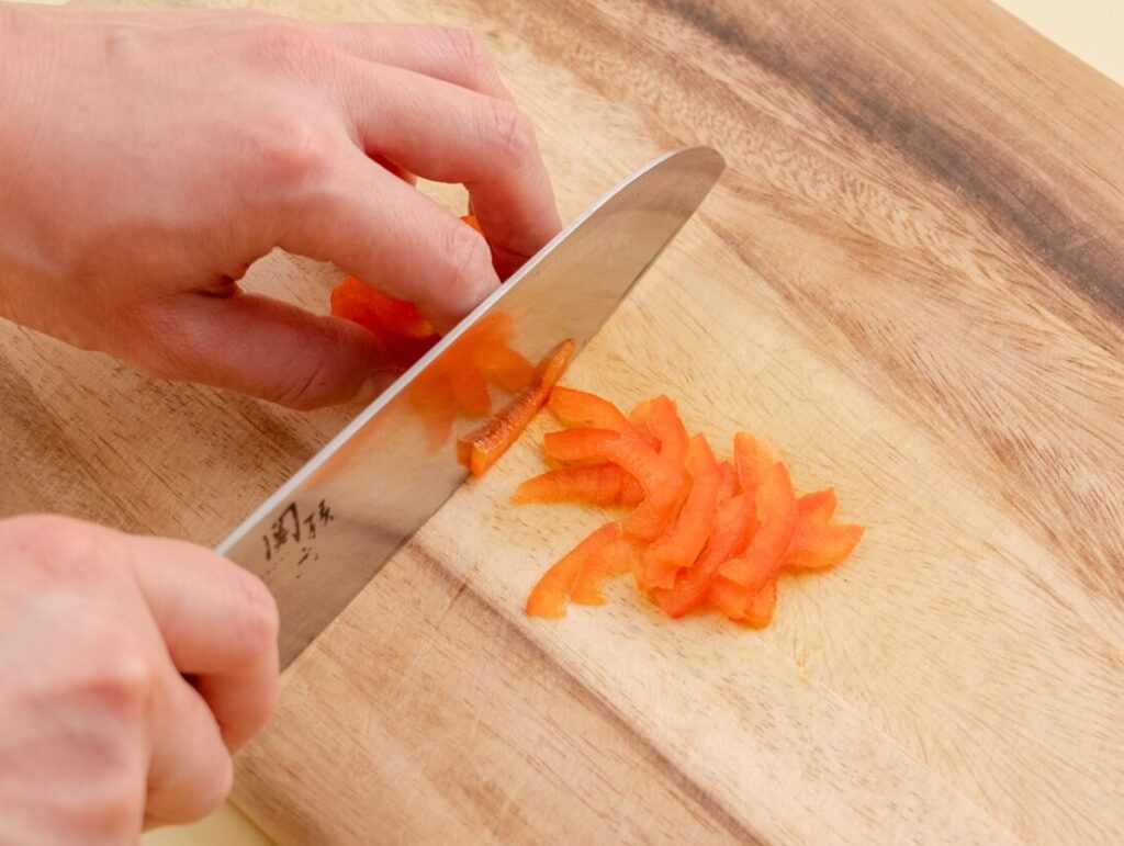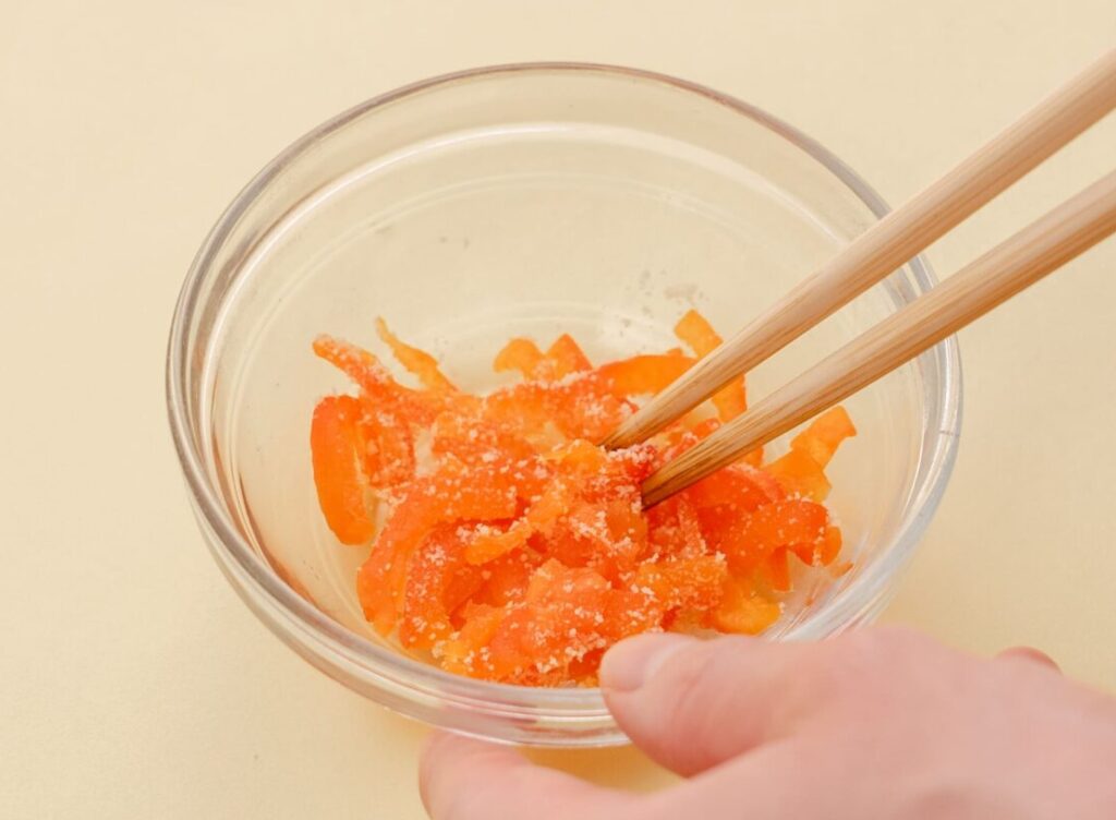 パプリカは皮をむき、細切りにして、やわらかくゆでる。