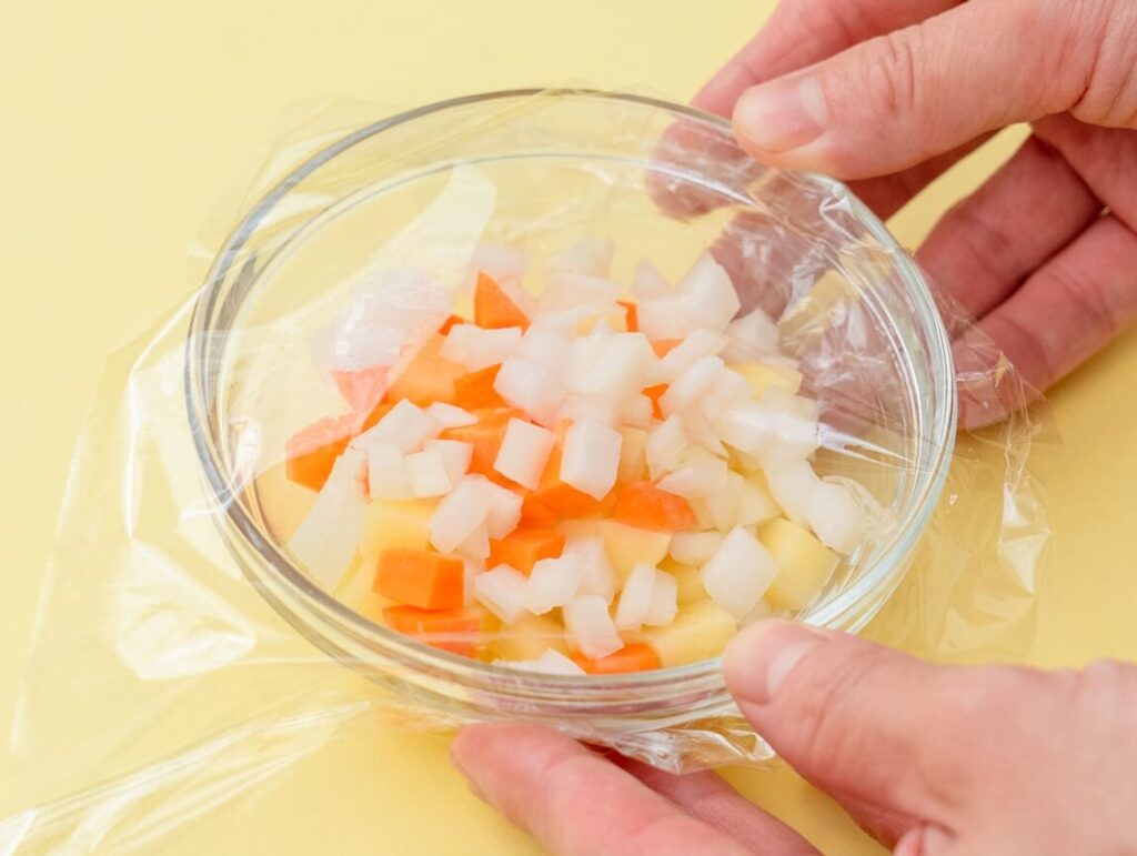 じゃがいもは1cmの角切り、にんじんは7mmの角切り、玉ねぎは5mmサイズに切り、耐熱容器に入れて水をふりかけてふんわりとラップをし、電子レンジ(600W)で約1分30秒加熱する。
