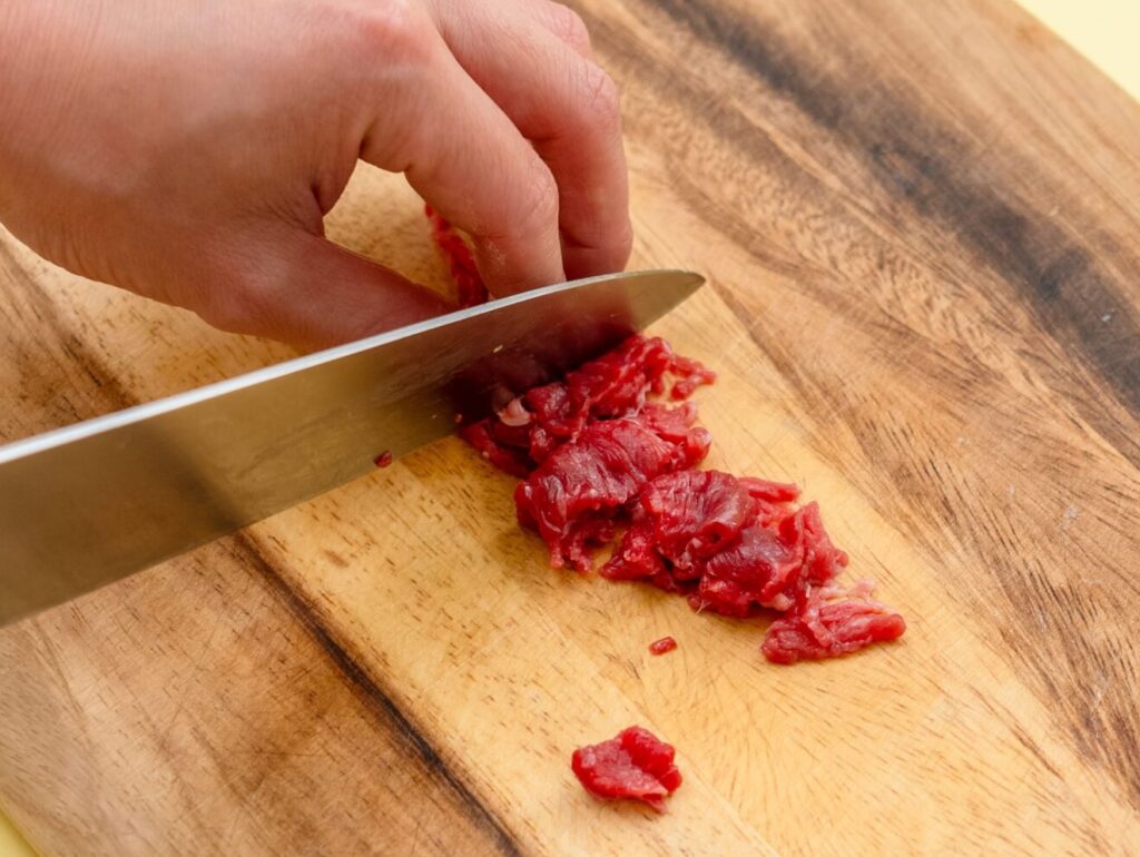 牛赤身薄切り肉は1cm長さの細切りにする。