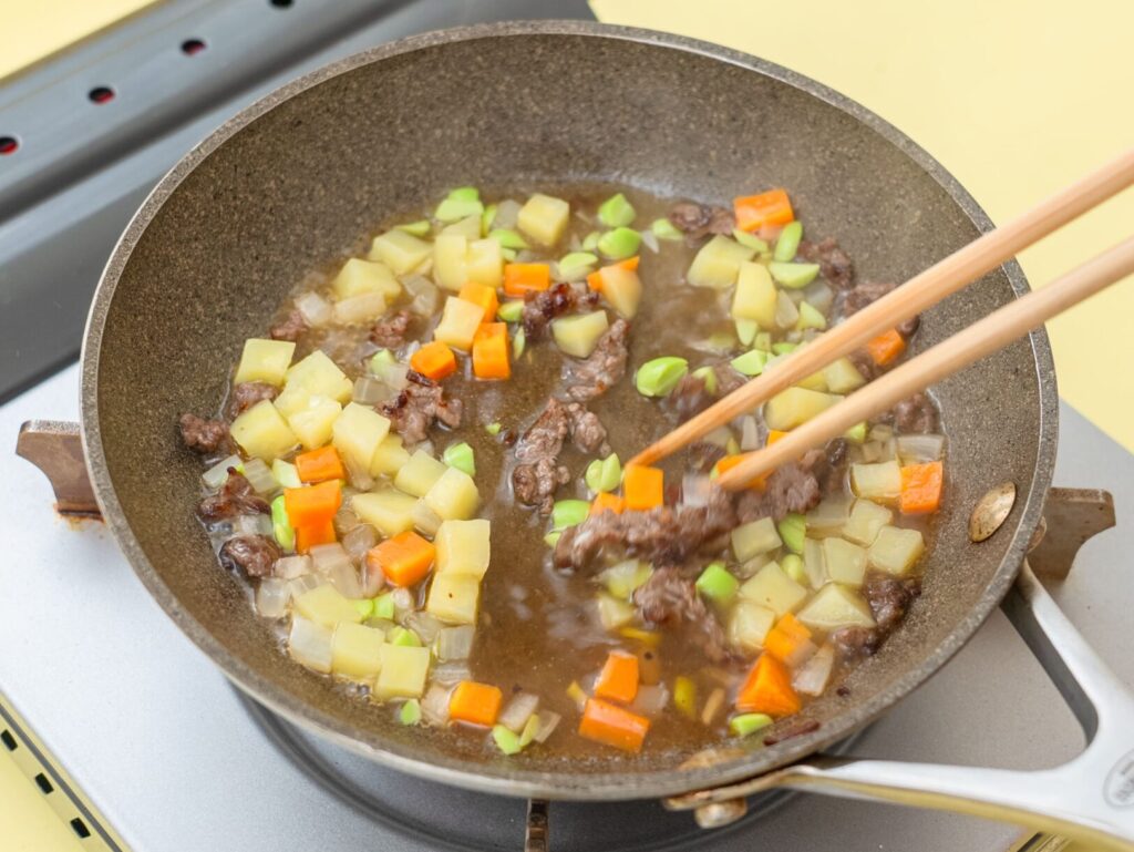 フライパンにサラダ油を熱し、①をしっかり火が通るまで炒め、②、③、【A】を加え、煮汁がなくなるまで弱火で煮る。