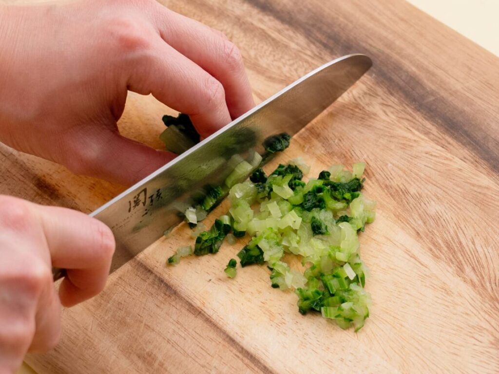 小松菜はやわらかくゆで、こまかく刻む。