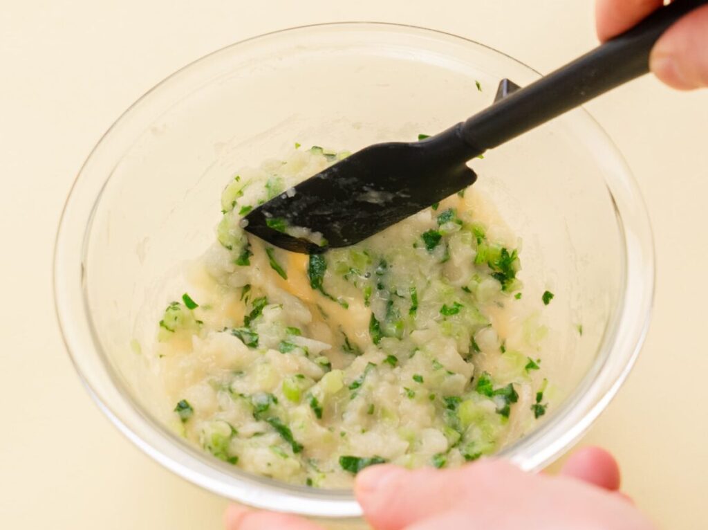 じゃがいもは皮をむいてやわらかくゆで、熱いうちにすりつぶし、①と溶き卵を加えて混ぜる。