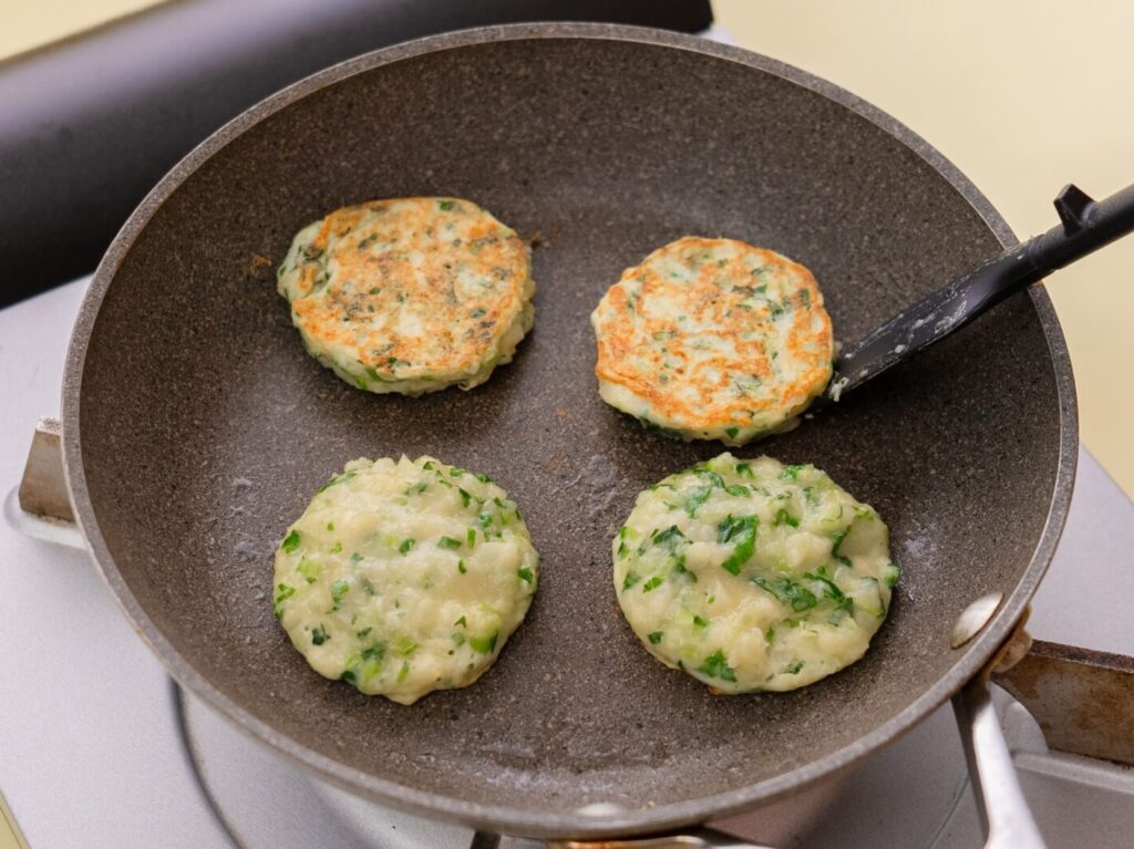 フライパンに油を中火で熱し、②をスプーンで一口大に落とし入れ、2分ほどかけて両面をこんがりと焼く。
