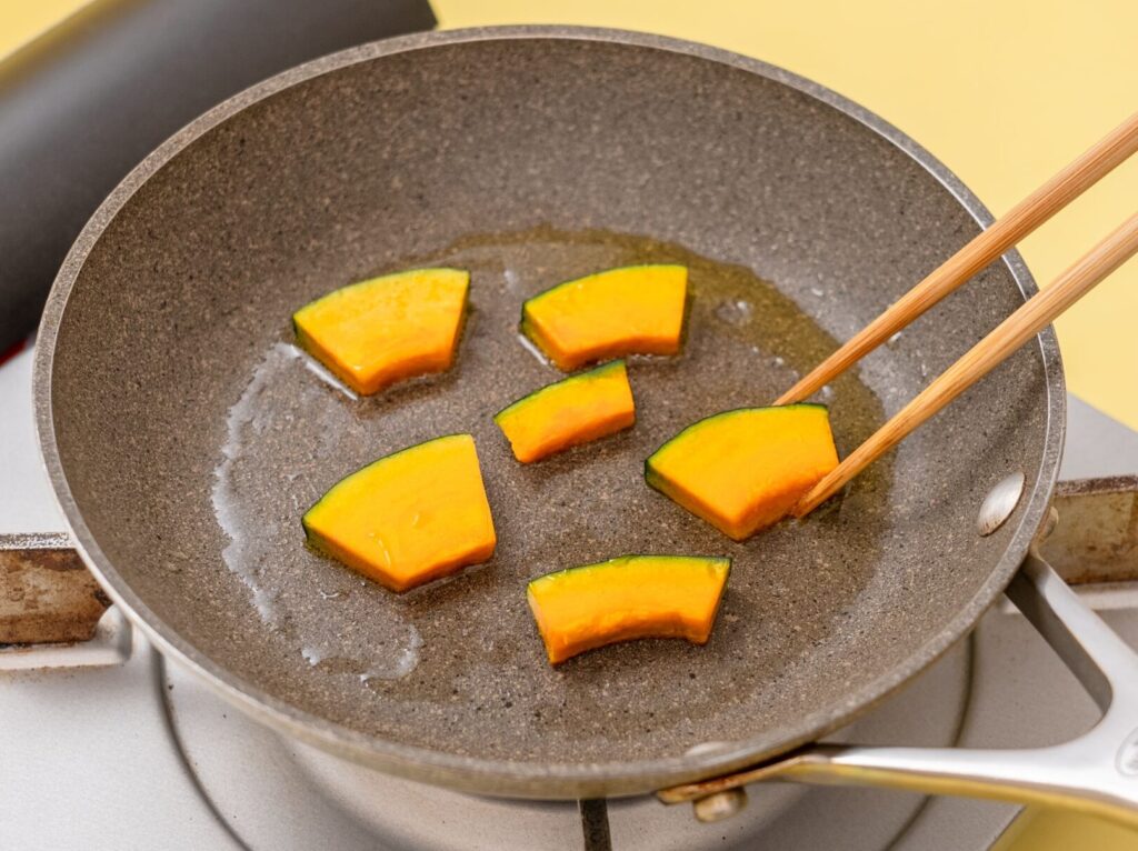フライパンにサラダ油を熱し、かぼちゃを並べ、弱火で火が通るまで揚げ焼きにする。焼けたらペーパータオルなどにのせ、油をきる。