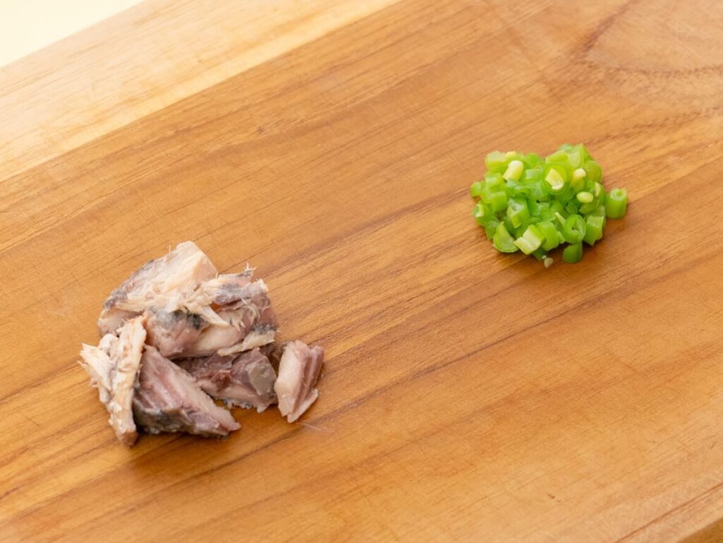 さやいんげんはやわらかくゆでて、粗みじん切りにする。さば(水煮缶)は骨を取り除いて汁けをきり、粗くほぐす。