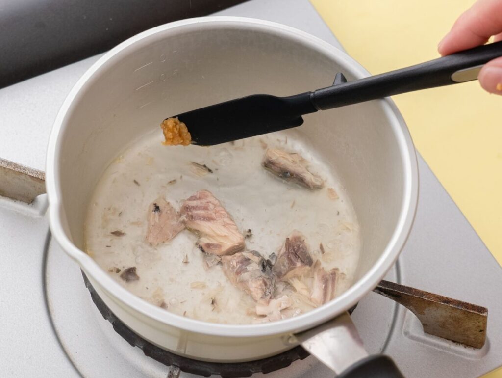 小鍋に①のさばと、だし汁を入れて煮て、みそを加える。