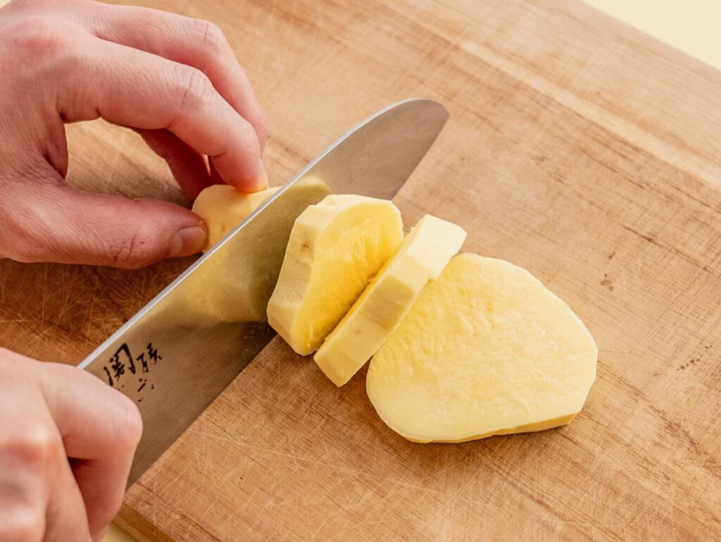 さつまいもの皮を厚めにむき、1cm厚さの輪切りにして水にさらす。