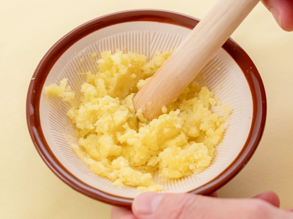 ザルにあげ、すり鉢などですりつぶし(ハンドブレンダーなどを使用してもOK)、お湯を加えてなめらかになるまでのばす。