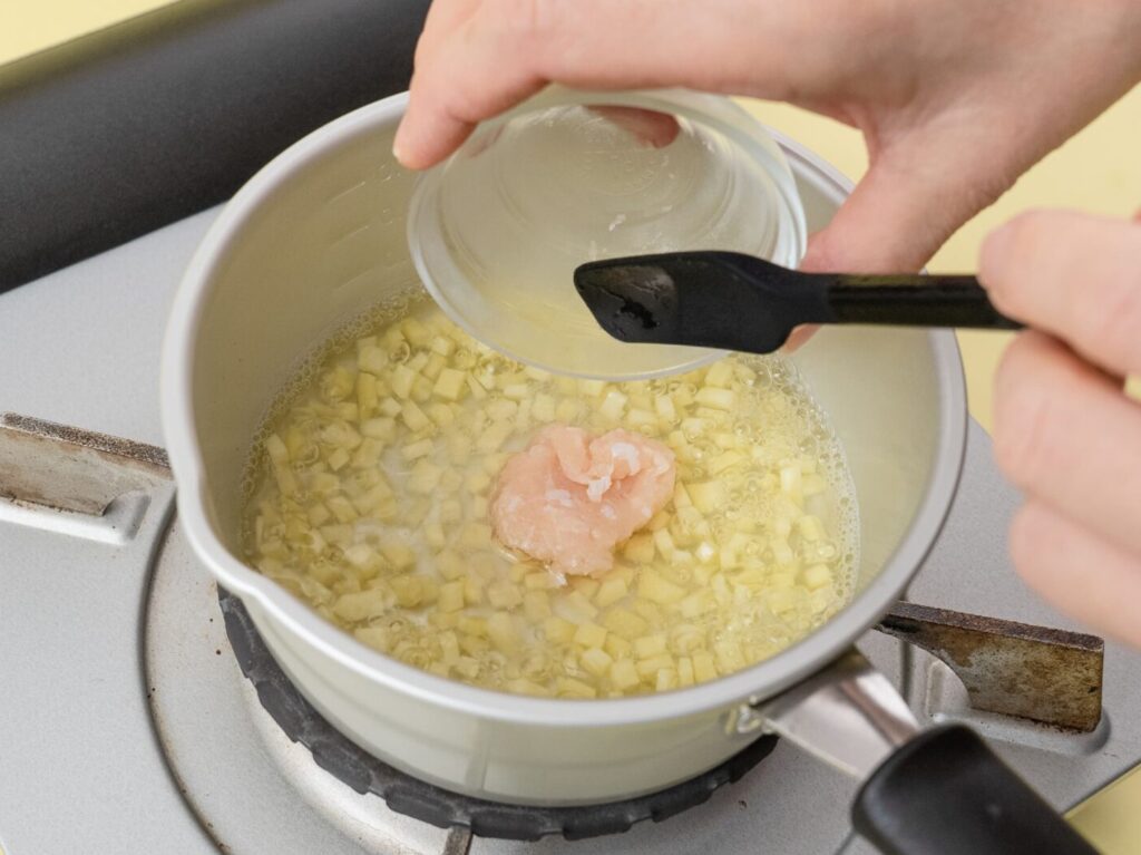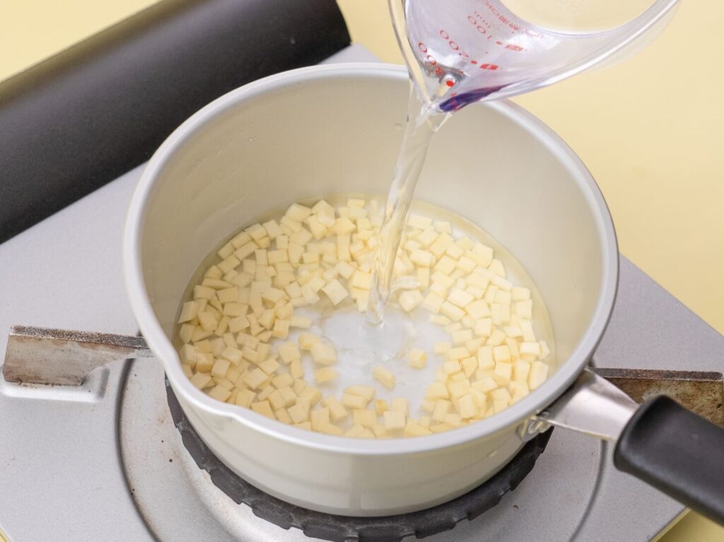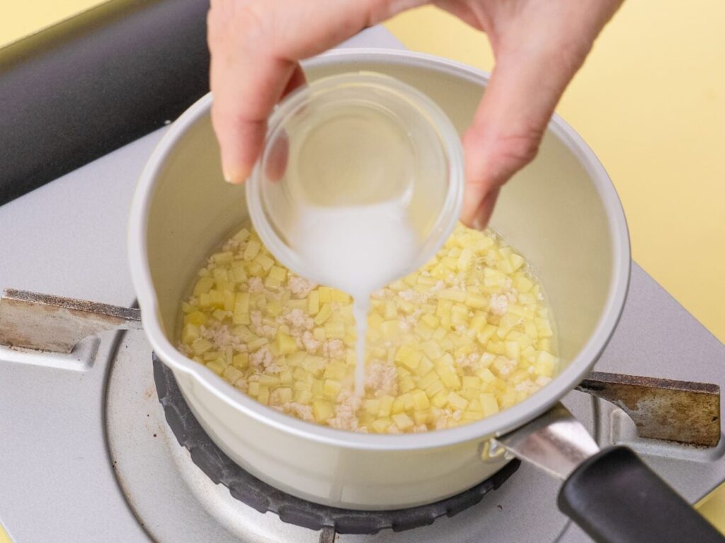 小鍋にだし汁、さつまいも、浸るぐらいの水を入れ、さつまいもがやわらかくなるまで煮る。