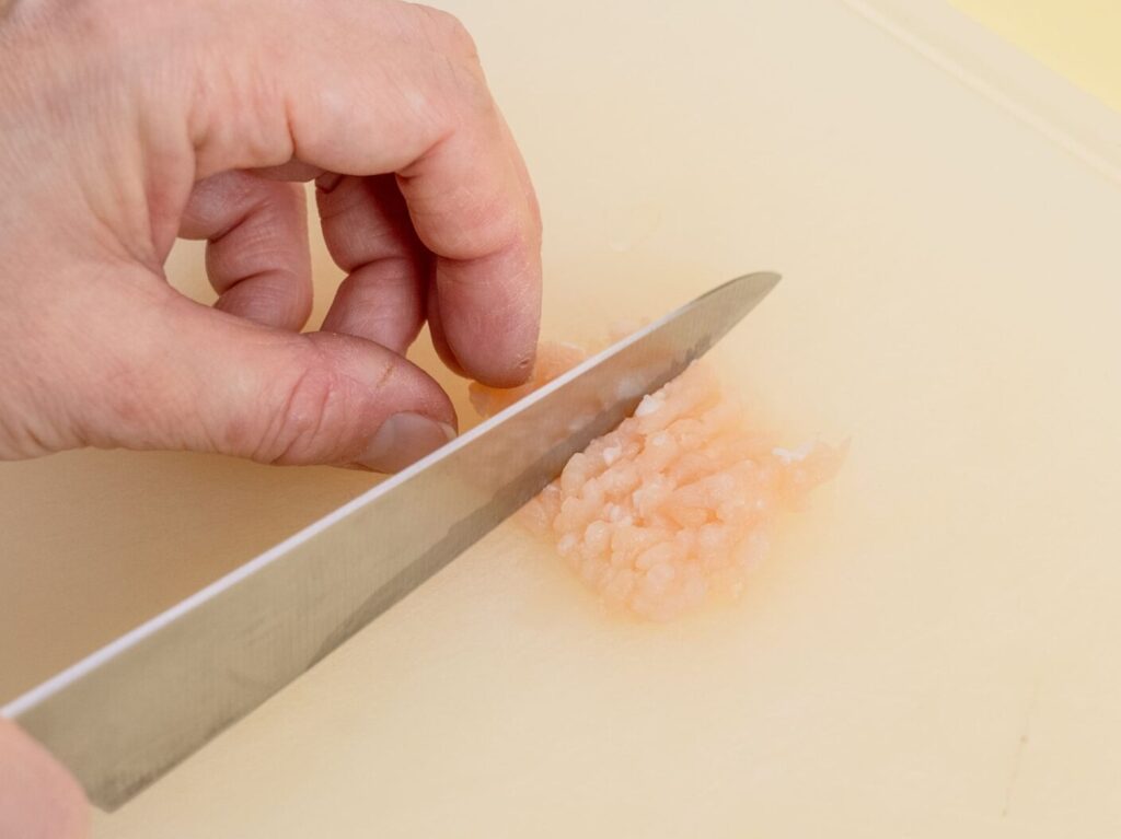 さつまいもの皮を厚くむき、3mm角に切って水にさらす。鶏ひき肉は細かく刻む。