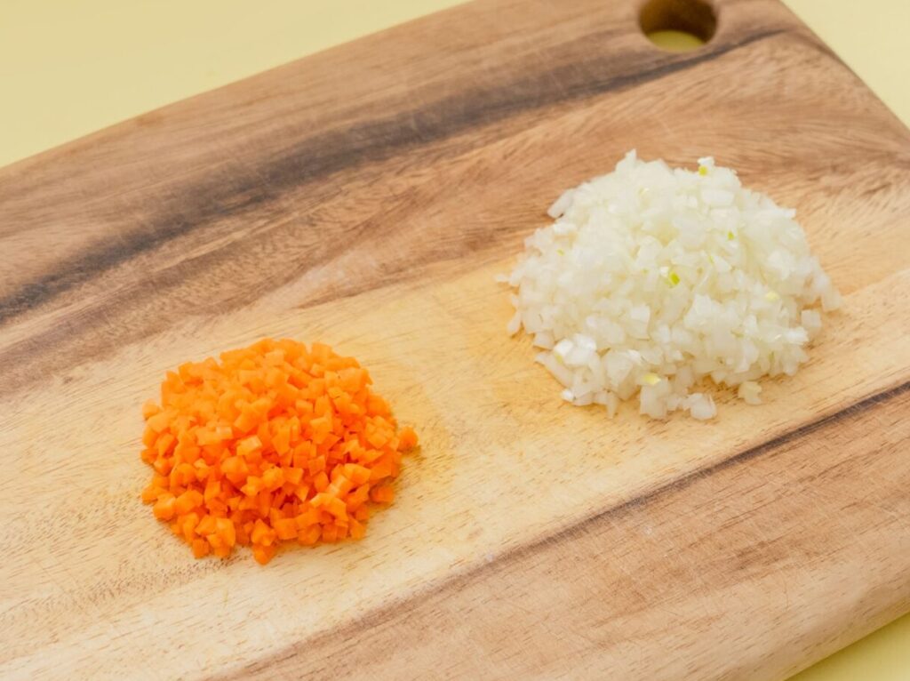 にんじん、玉ねぎは、皮をむき、みじん切りにする。