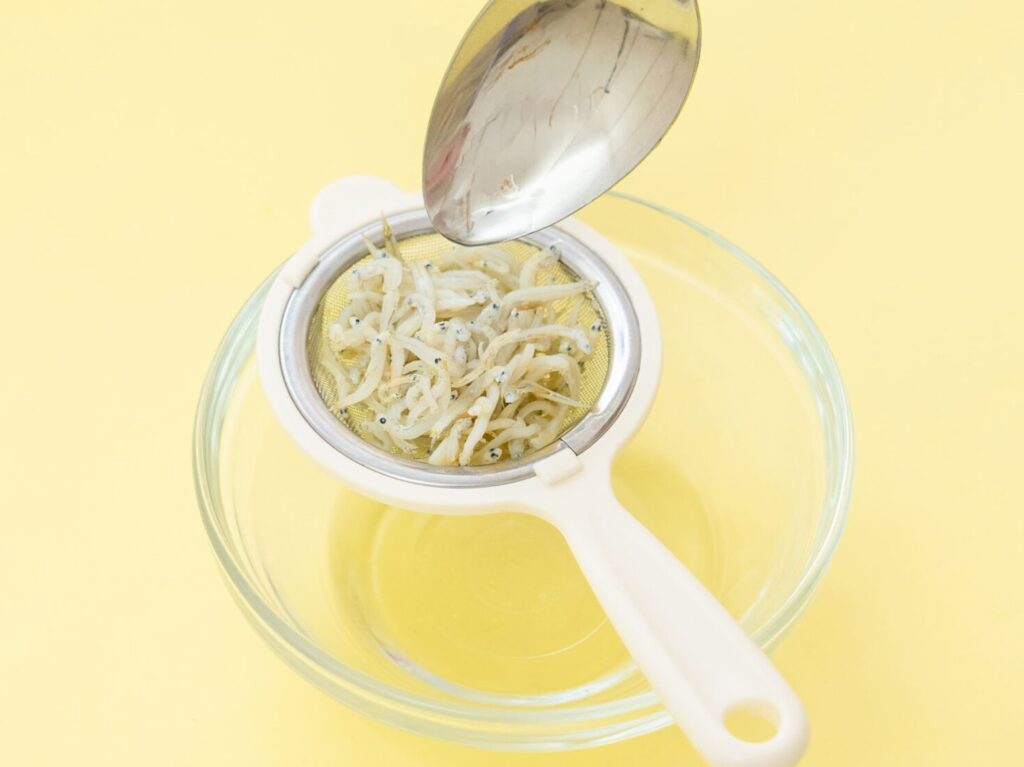しらすは茶こしに入れ、お湯をかけて塩気を抜く。