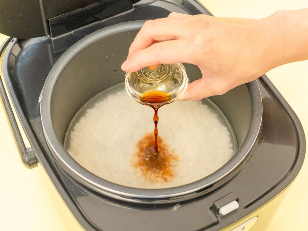 炊飯器にといだ米、水を入れ、みりんとしょうゆを加える。