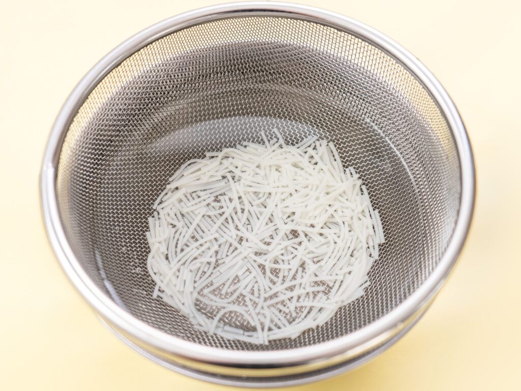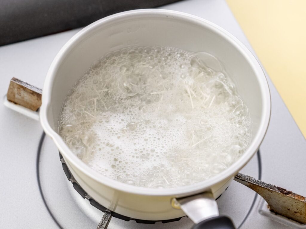 小鍋にたっぷりの湯を沸かし、沸騰したらめんを入れ、大人用よりもやわらかくなるまで茹でる。(表示の2倍の時間ぐらいが目安)