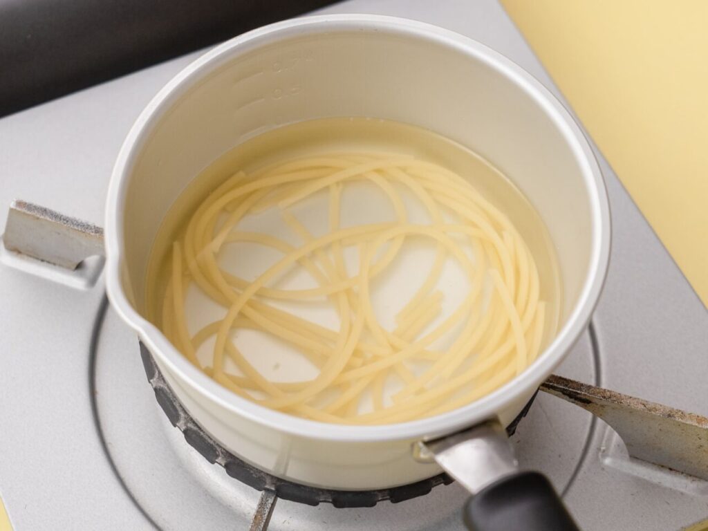 鍋に湯を沸かし、塩は加えずにスパゲティを入れ、やわらかくなるまで茹でる。(袋の表示の2倍の時間)