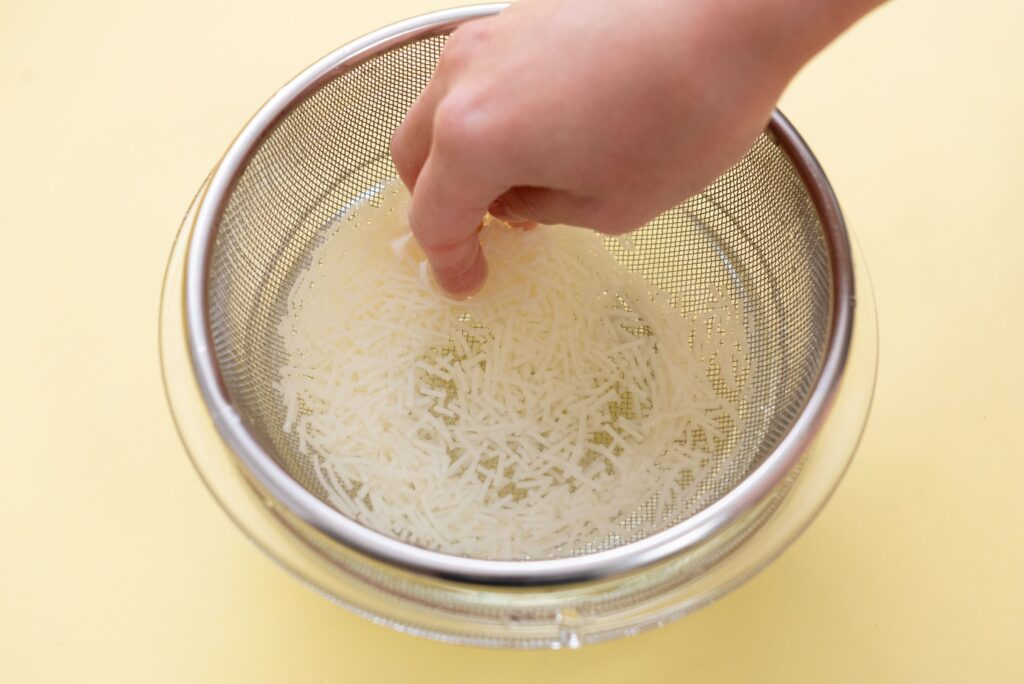 ②をやわらかく茹で、流水でよく洗い塩気をぬく。