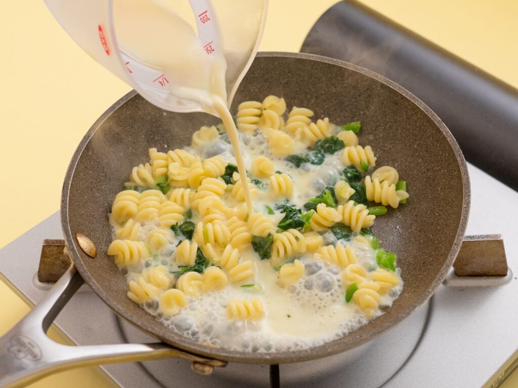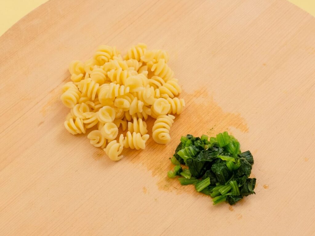 ほうれん草はやわらかくゆで、1cm長さに刻む。パスタは表示より少し長めにやわらかくゆで、食べやすく切る。