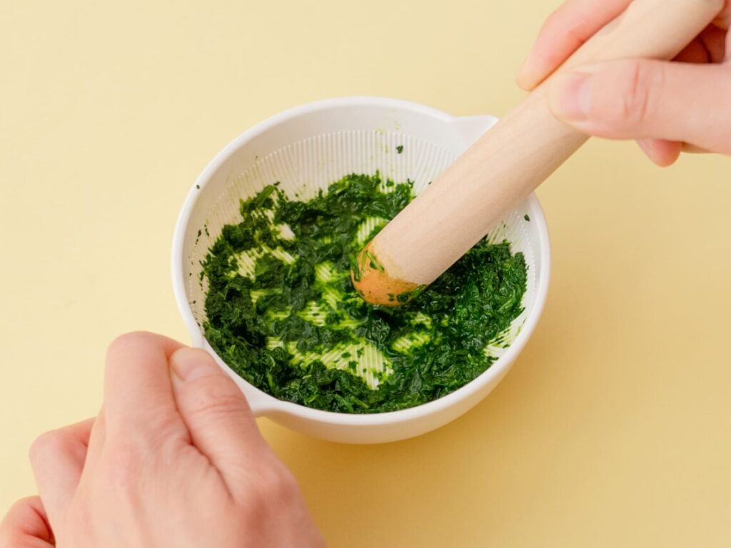 ②をみじん切りにしてすり鉢などですりつぶし(ハンドブレンダーなどを使用してもOK)、裏ごしする。