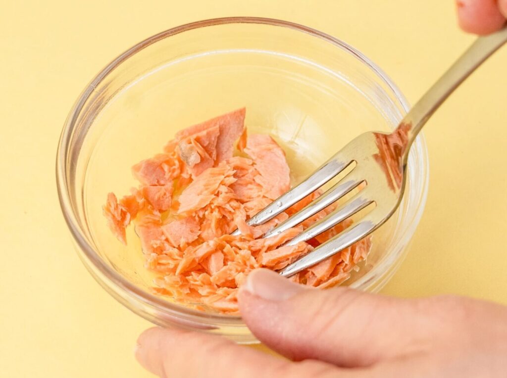生鮭は火が通るまでゆでて、細かくほぐす。
