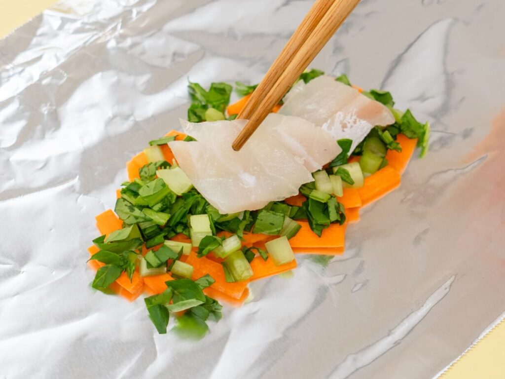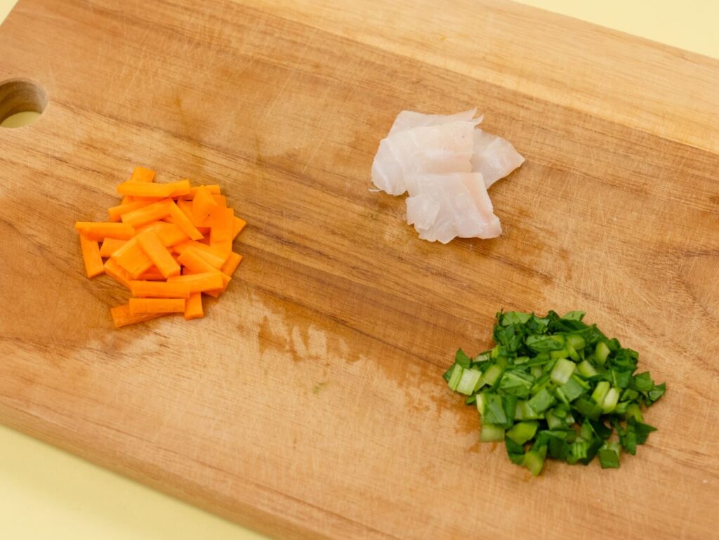 鯛は食べやすいサイズに、小松菜は5〜6mmサイズに、にんじんは2cm長さ×7mm幅の短冊切りにする。