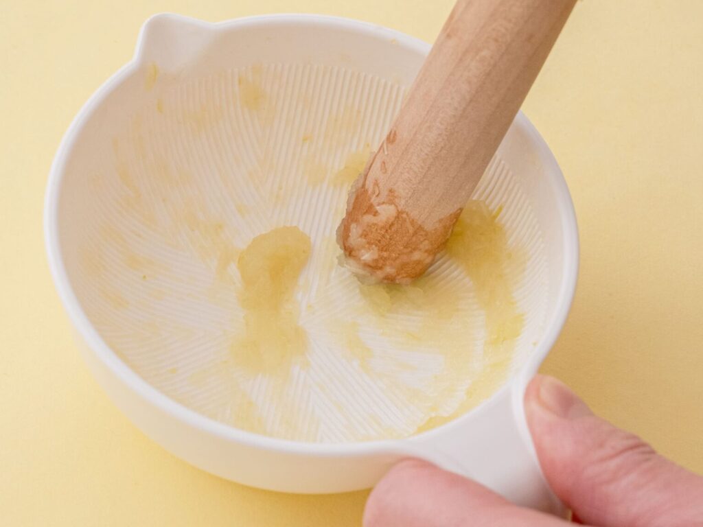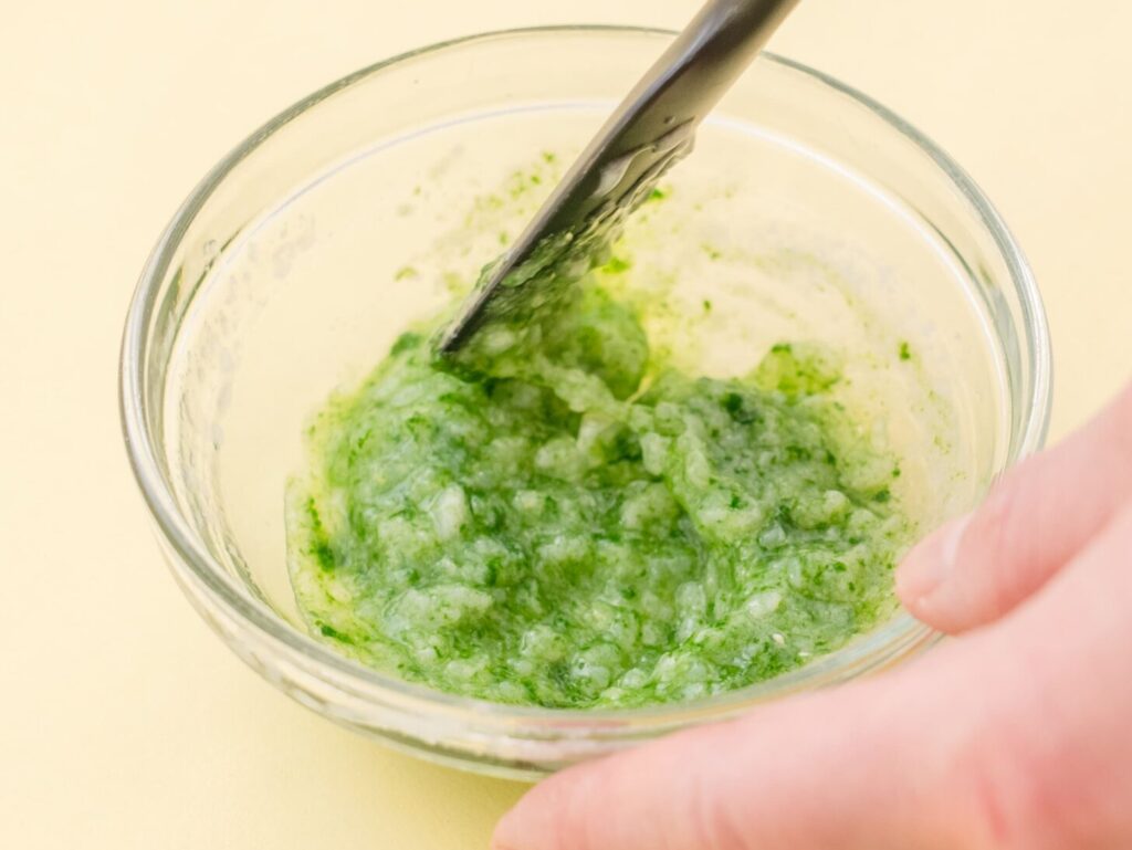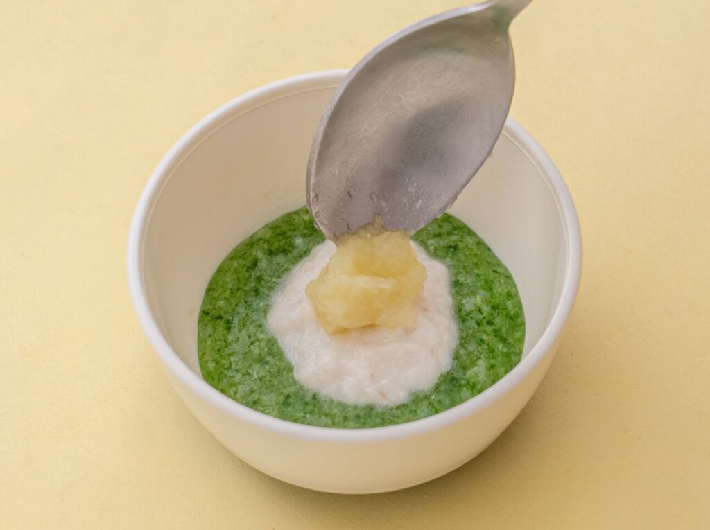 ほうれん草の葉先を柔らかくゆでた後、水にさらしてあくを取り除く。すりつぶしてから裏ごしし、10倍がゆと混ぜる。