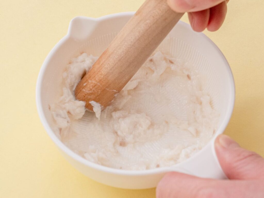 鯛に片栗粉(分量外)をまぶしてからゆで、少量のゆで汁を加えて滑らかになるまですりつぶす。
