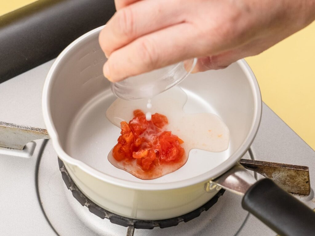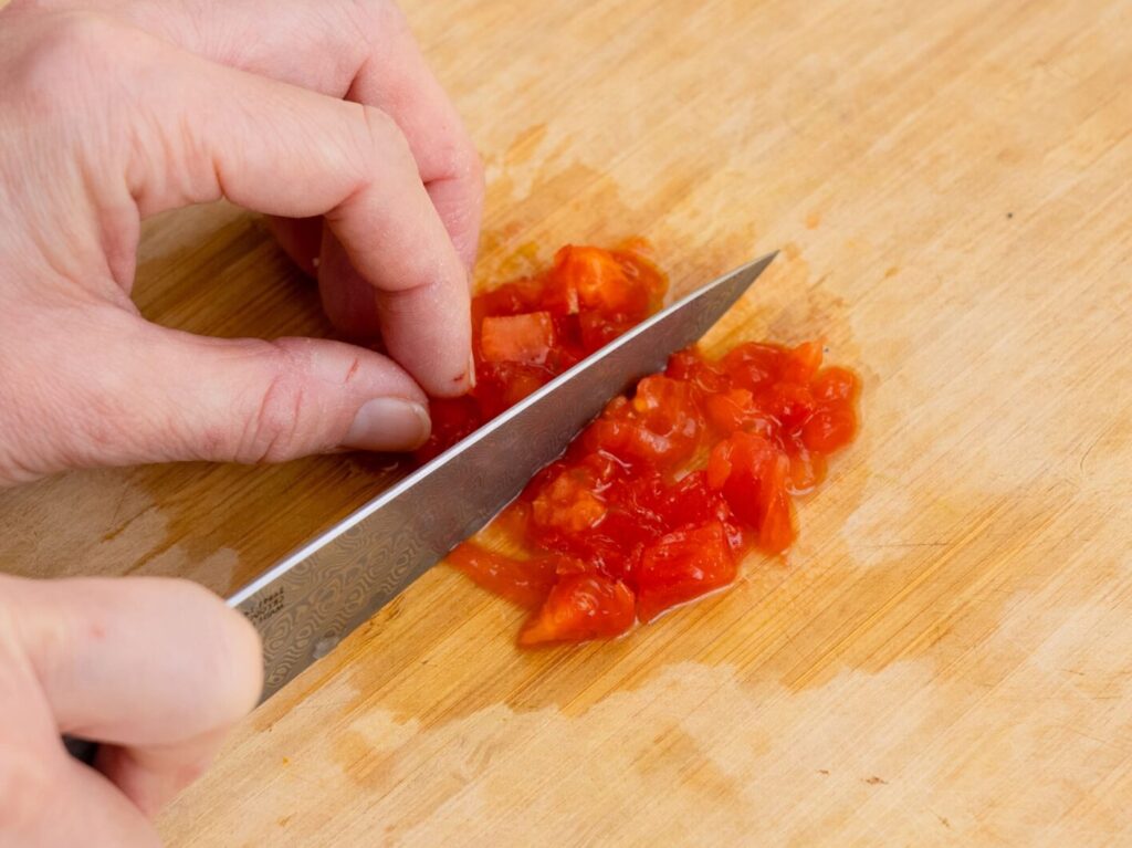 ミニトマトは湯むきをして種を取り除き、みじん切りにする。
