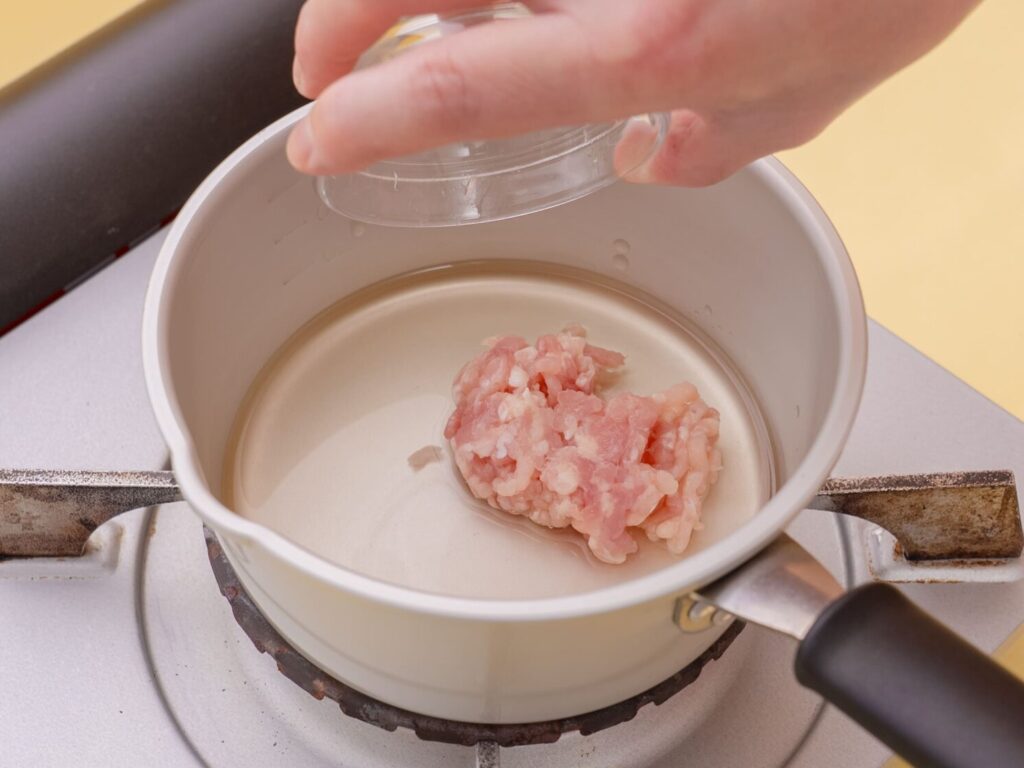 鍋にだし汁を入れ、鶏ひき肉を細かく崩しながら中火で煮る。