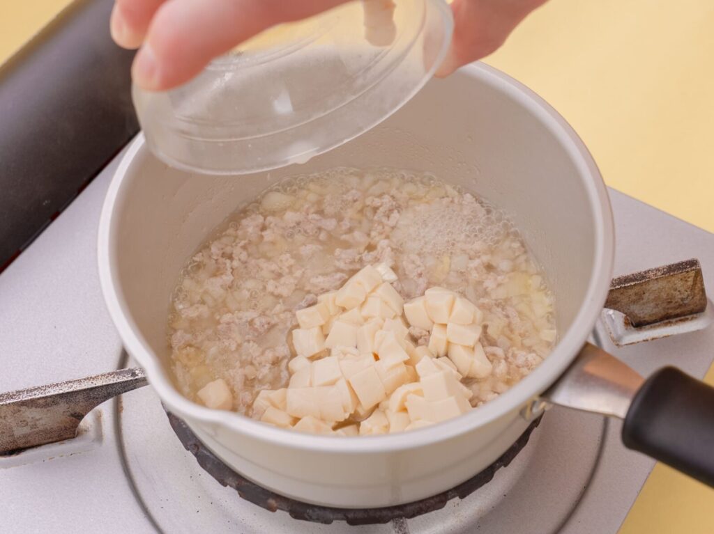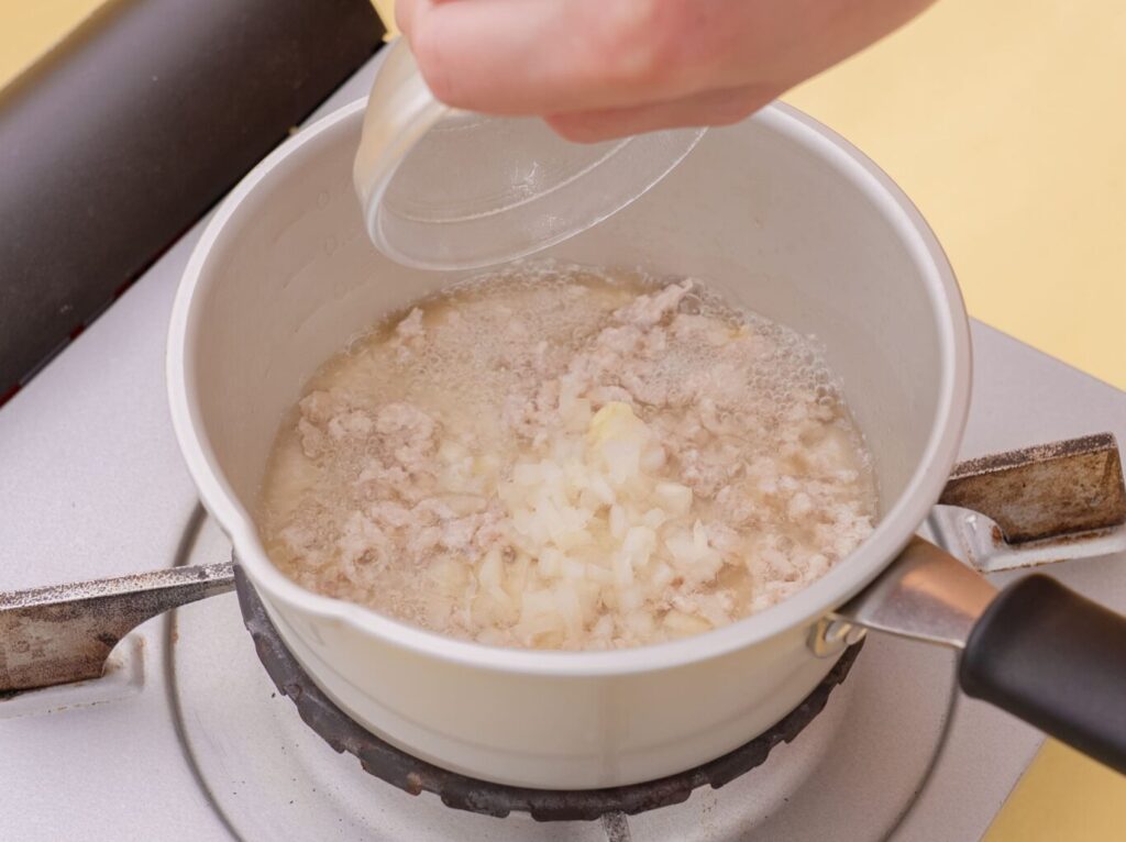 玉ねぎはみじん切りにし、①に加えて柔らかくなるまで煮る。