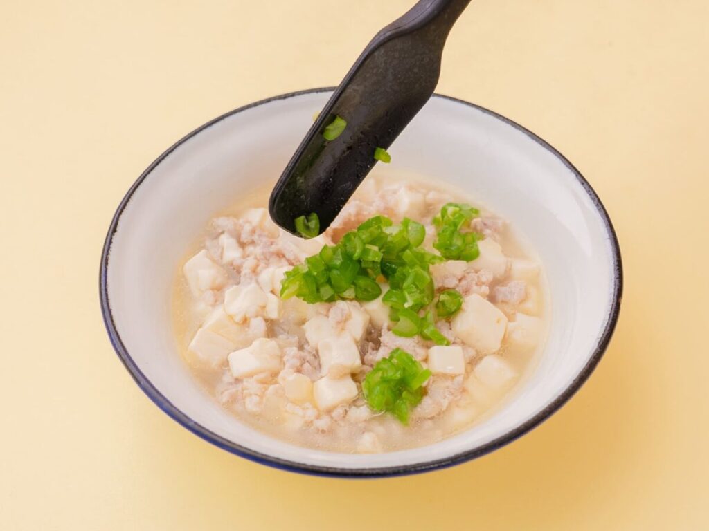別鍋でゆでた豆腐を2~3mm角に切り、②に加えてひと煮立ちさせる。水溶き片栗粉を加え、とろみがつくまで加熱する。