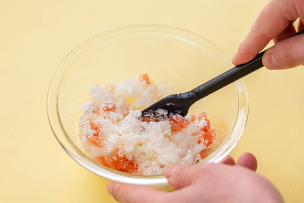 ボウルに軟飯、①、粉チーズ、小麦粉を入れて混ぜる。