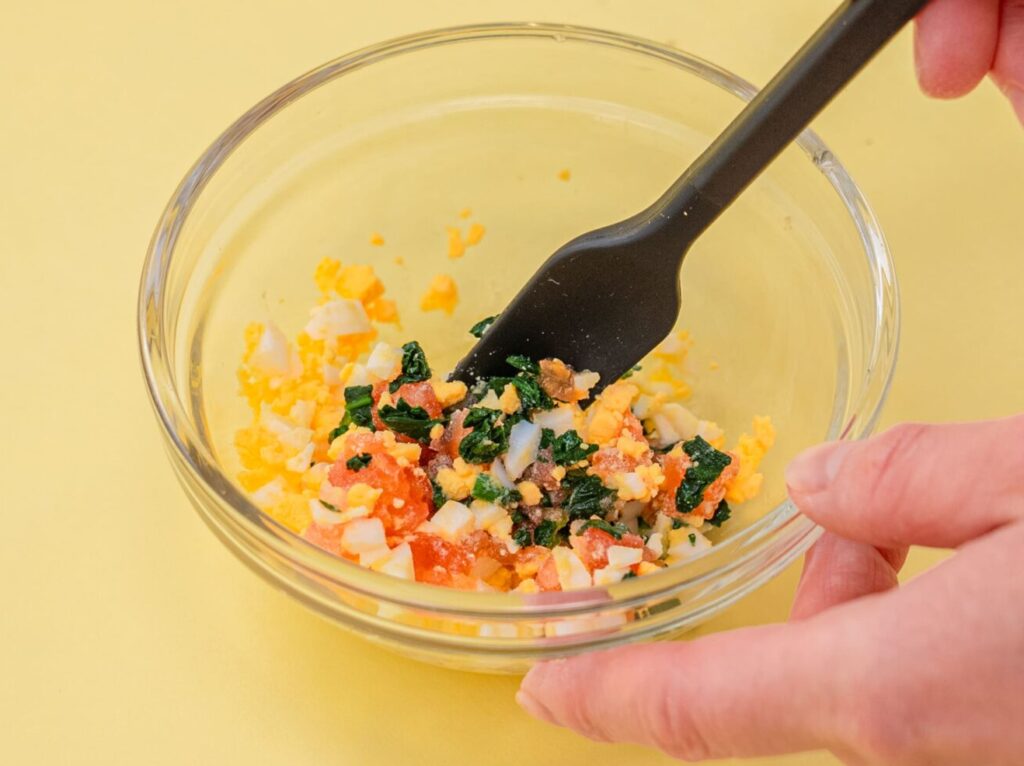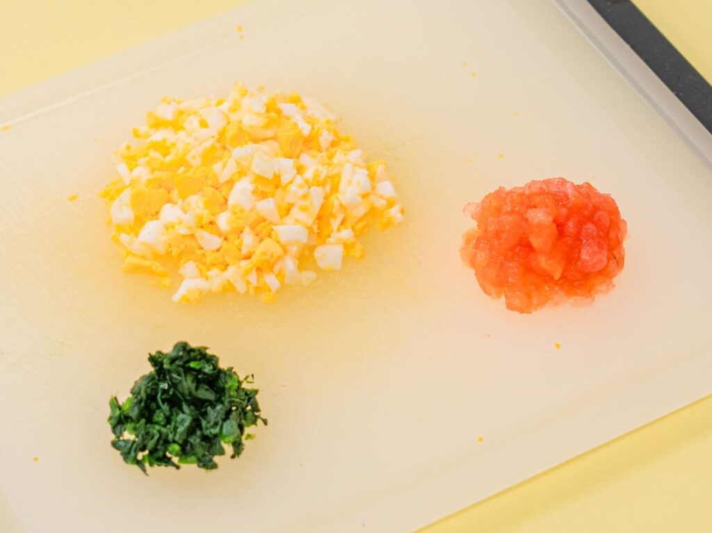 ゆで卵はみじん切りにする。トマトは皮をむいて種を取り除き、みじん切りにする。ほうれん草はゆでてみじん切りにする。