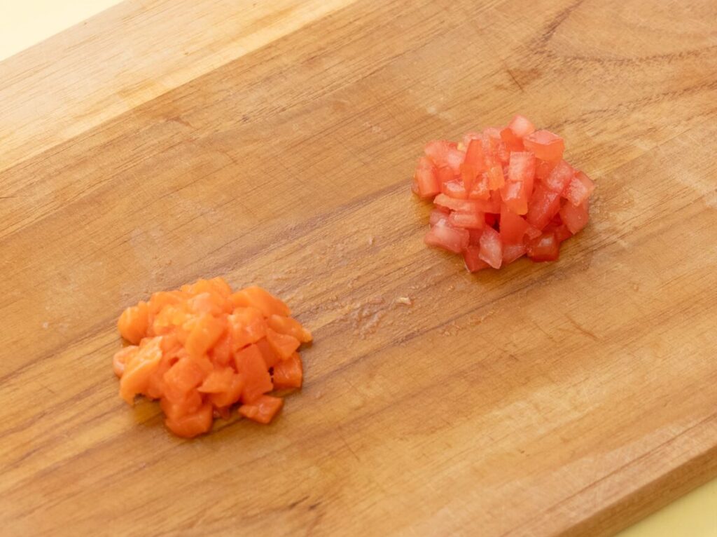 鮭は皮と骨を除き、粗く刻む。トマトは皮と種を除き、粗く刻む。