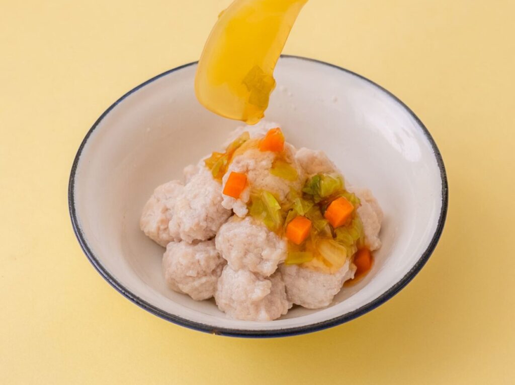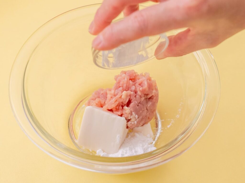 ボウルに豆腐、鶏ひき肉、片栗粉を入れて混ぜ合わせ、1cm大の肉団子を作る。