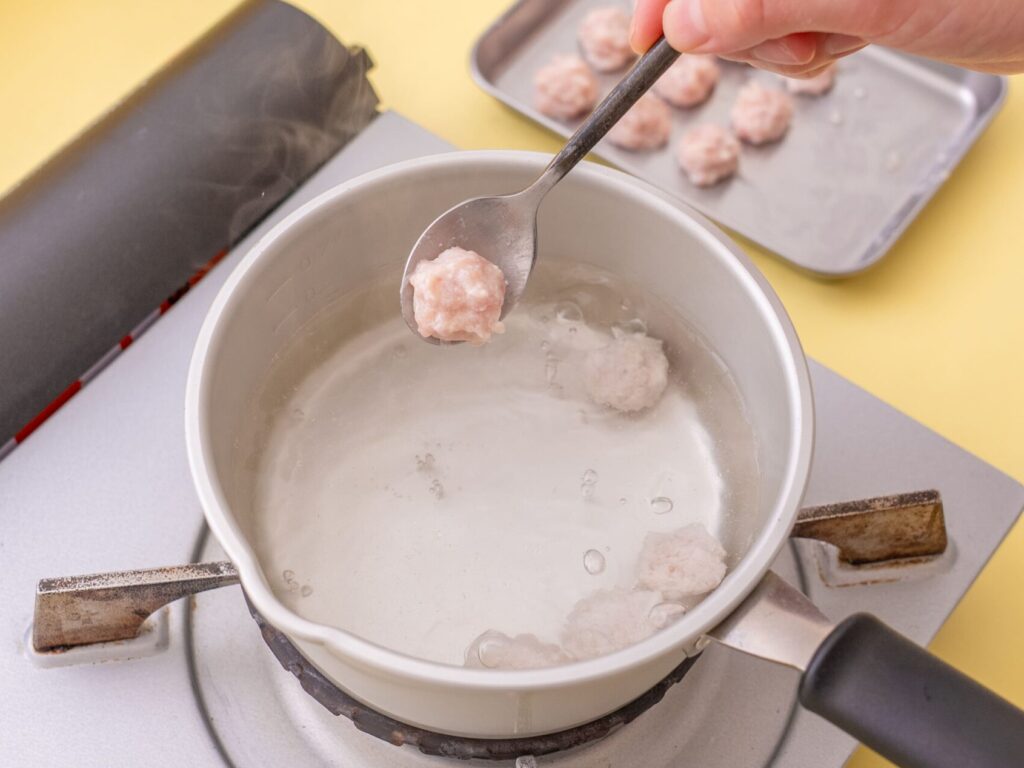 たっぷりのお湯に肉団子を入れ、中まで火が通るまで茹でて取り出す。