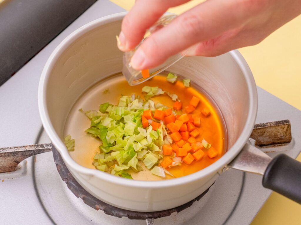 歯茎でつぶせるバナナくらいのかたさを目安に、お子様の様子に合わせて食材の大きさや固さ、量は調整してください。 - 初めての食材を与えるときは食物アレルギーに注意し、複数の食材といっしょに与えることはせず、小さじ1程度の量を午前中に与え、食後の様子を見守ってください。アレルギーのリスクがある場合やアレルギーと診断されている場合は、医師の指導に従ってください。
