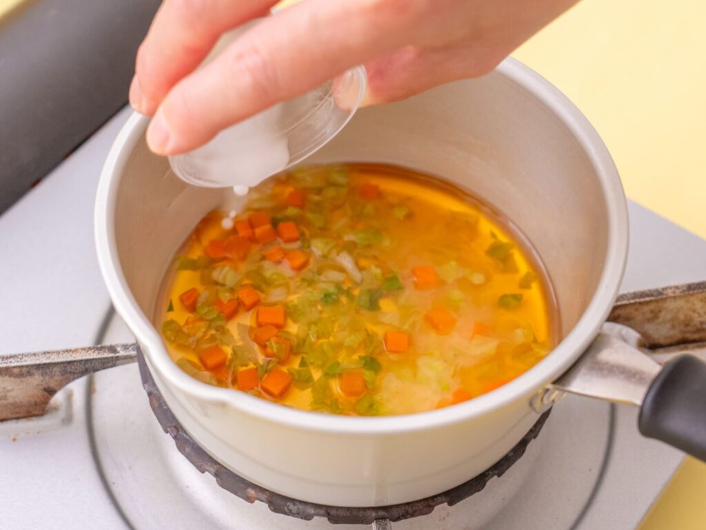 ④の鍋に水と片栗粉を合わせた水溶き片栗粉を入れてとろみがつくまで加熱する。