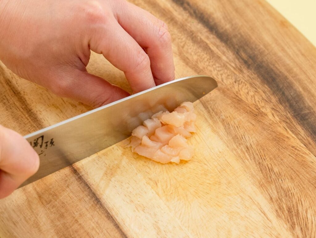 にんじんは皮をむき、粗みじん切りにする。鶏ささみ肉は粗みじん切りにする。
