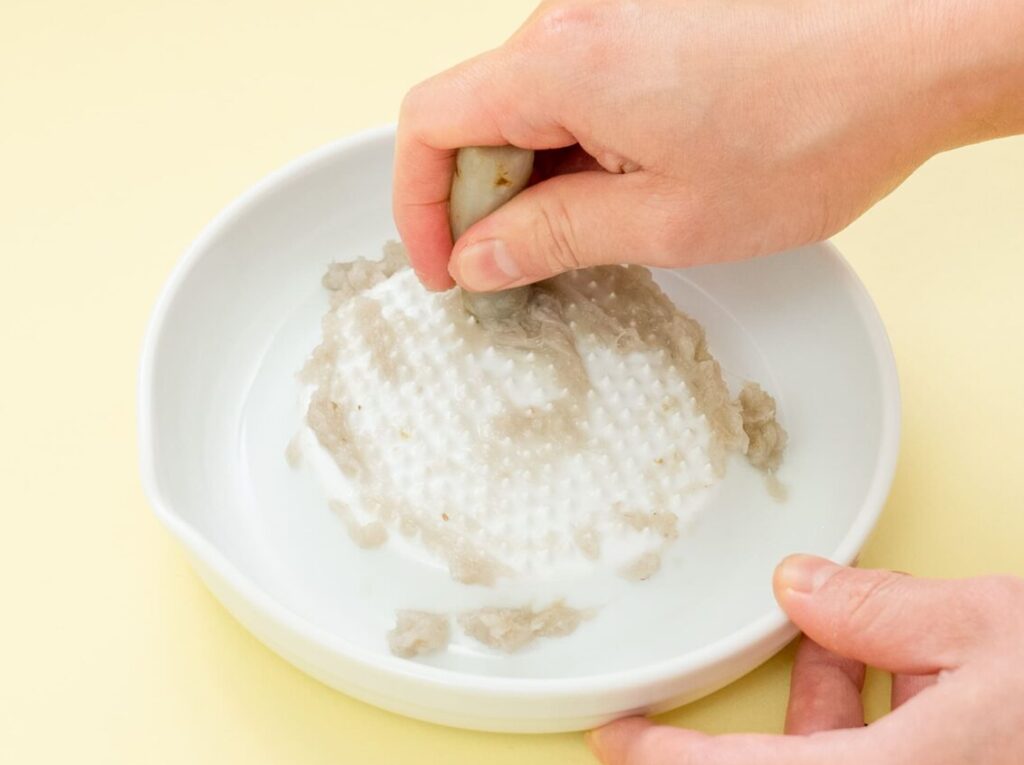 ①をやわらかくゆでて、すりおろす。