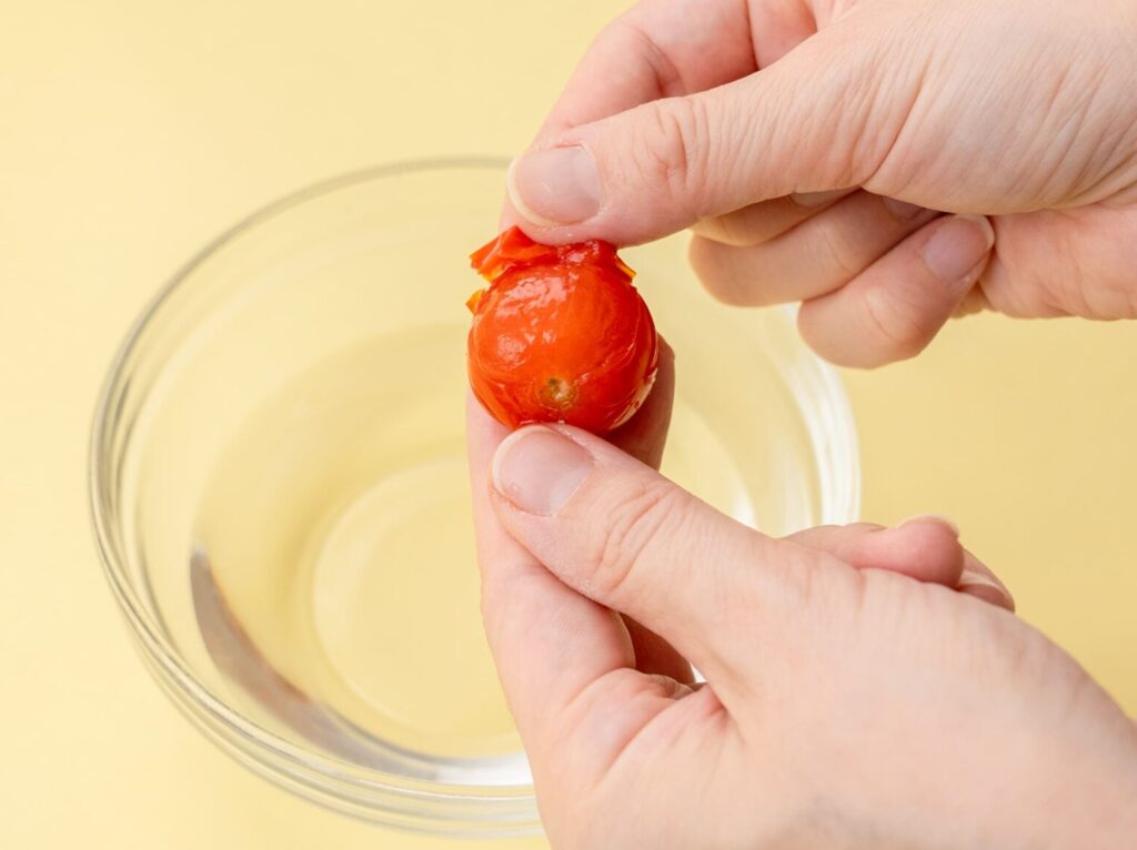 ミニトマトは皮を湯むきして種を取り除き、みじん切りにする。