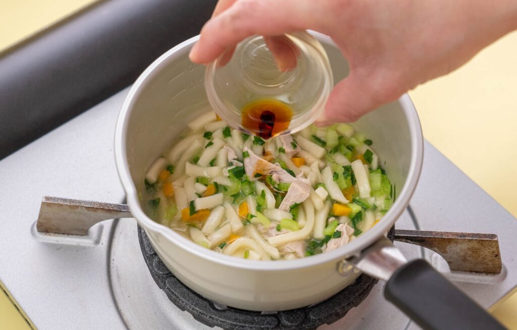 まぐろに火が通り、うどんと野菜がやわらかくなったら、まぐろを粗くほぐし、しょうゆを加えてさっと煮る。
