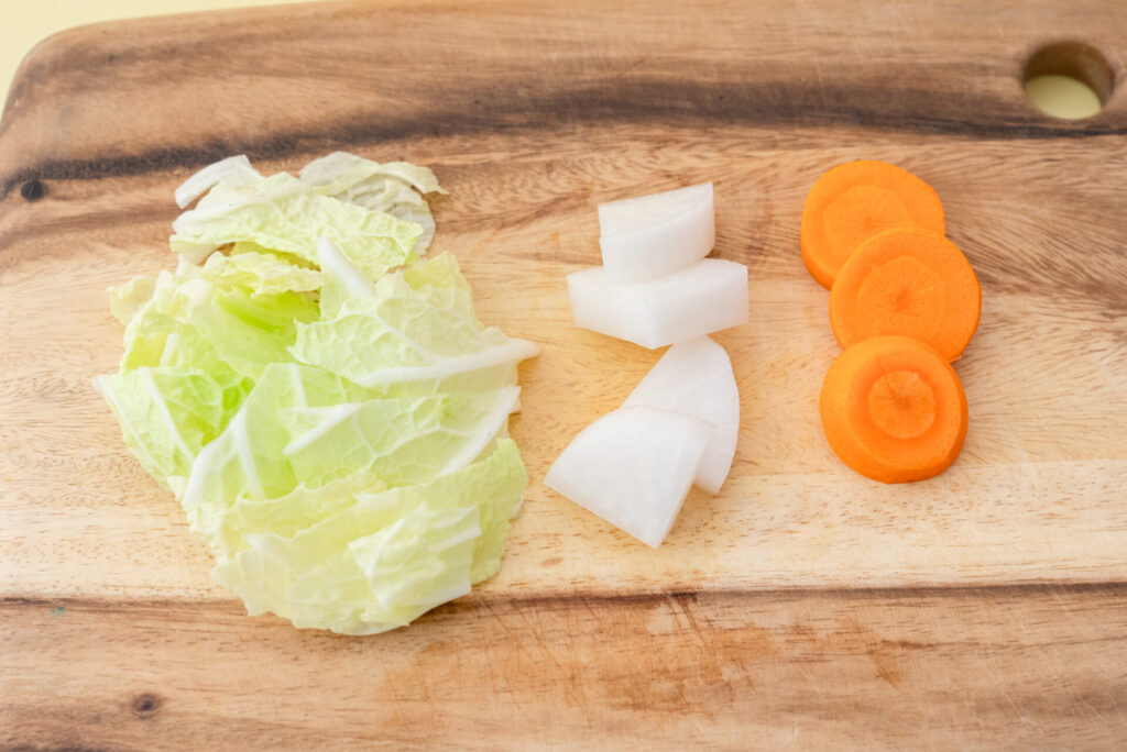 大根は皮をむいて1cm幅のいちょう切りにする。白菜は一口サイズに切る。にんじんは皮をむいて1cm幅の輪切りにする。