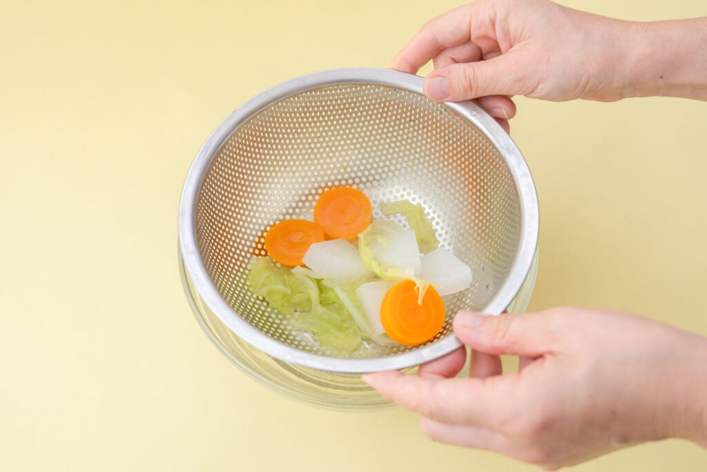 ※ゆでた野菜も離乳食の材料として使えます。野菜だしは小分けにして冷凍保存しておくとスープを作ったり飲み物として添えたり何かと使えて便利ですよ。